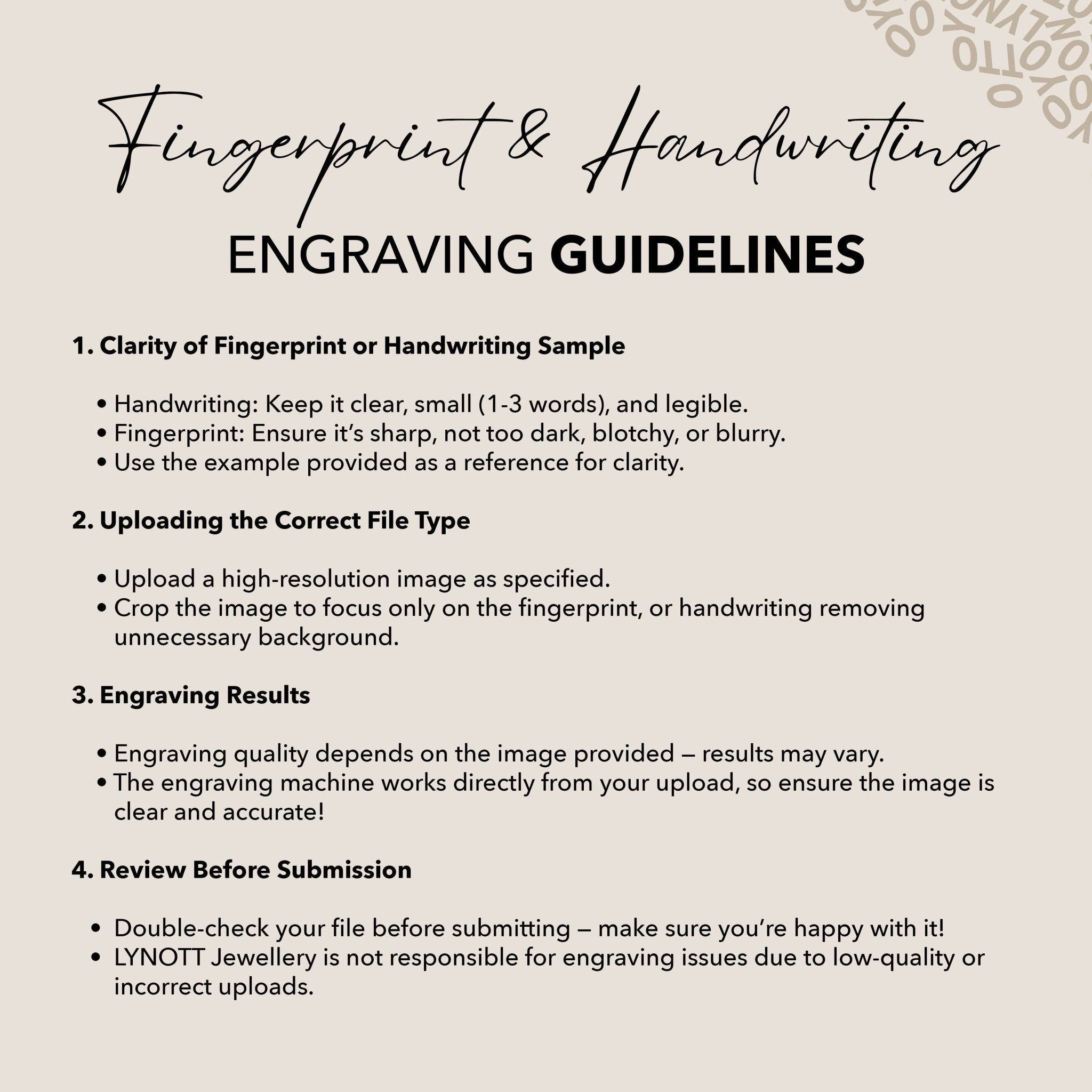 All products include a 3-month warranty covering manufacturing faults only. Permanent welded jewellery and fingerprint engraving are carried out at the customer’s own risk and are non-refundable once completed.
