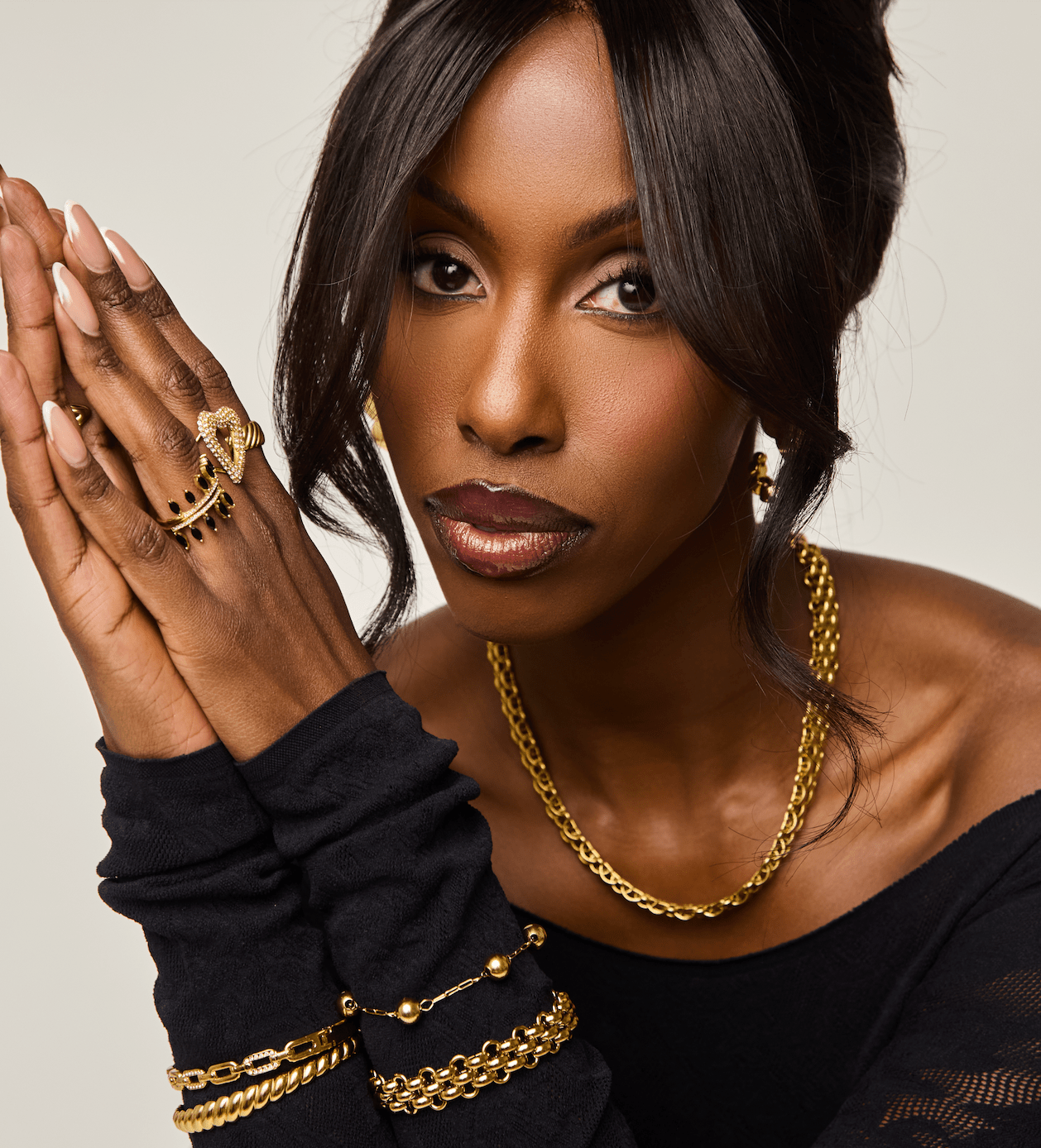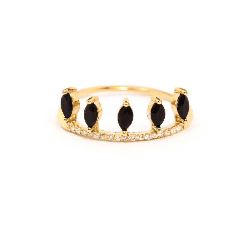 Bold, architectural, and undeniably chic, the Onyx Throne Ring features a striking black onyx-style centerpiece held in a deep, textured gold setting. Curated by Katja Mia for those who love a "more is more" approach to stacking, this ring serves as the perfect anchor for any hand-stack. The innovative adjustable band ensures a perfect fit on any finger, making it as versatile as it is beautiful.
