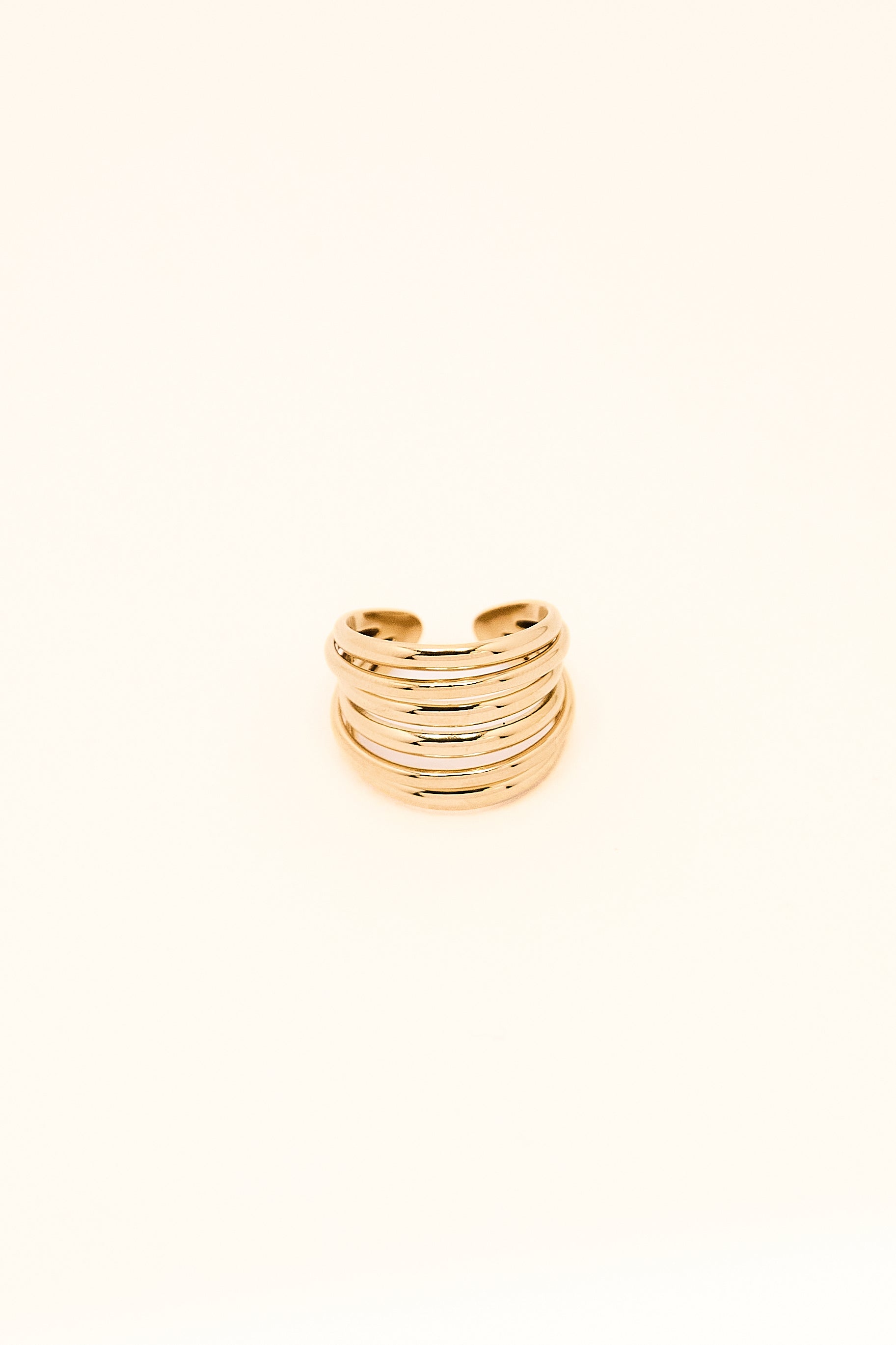 Why wear one ring when you can wear them all? The Muse Ring features a bold, chunky silhouette designed with multiple gold-layered bands fused into one seamless statement piece. Curated by Katja Mia for its architectural "cool-girl" aesthetic, this ring provides high-impact texture and volume with zero effort. Crafted in 18k gold plating, it offers a heavy, luxury feel that stays polished through every wear.