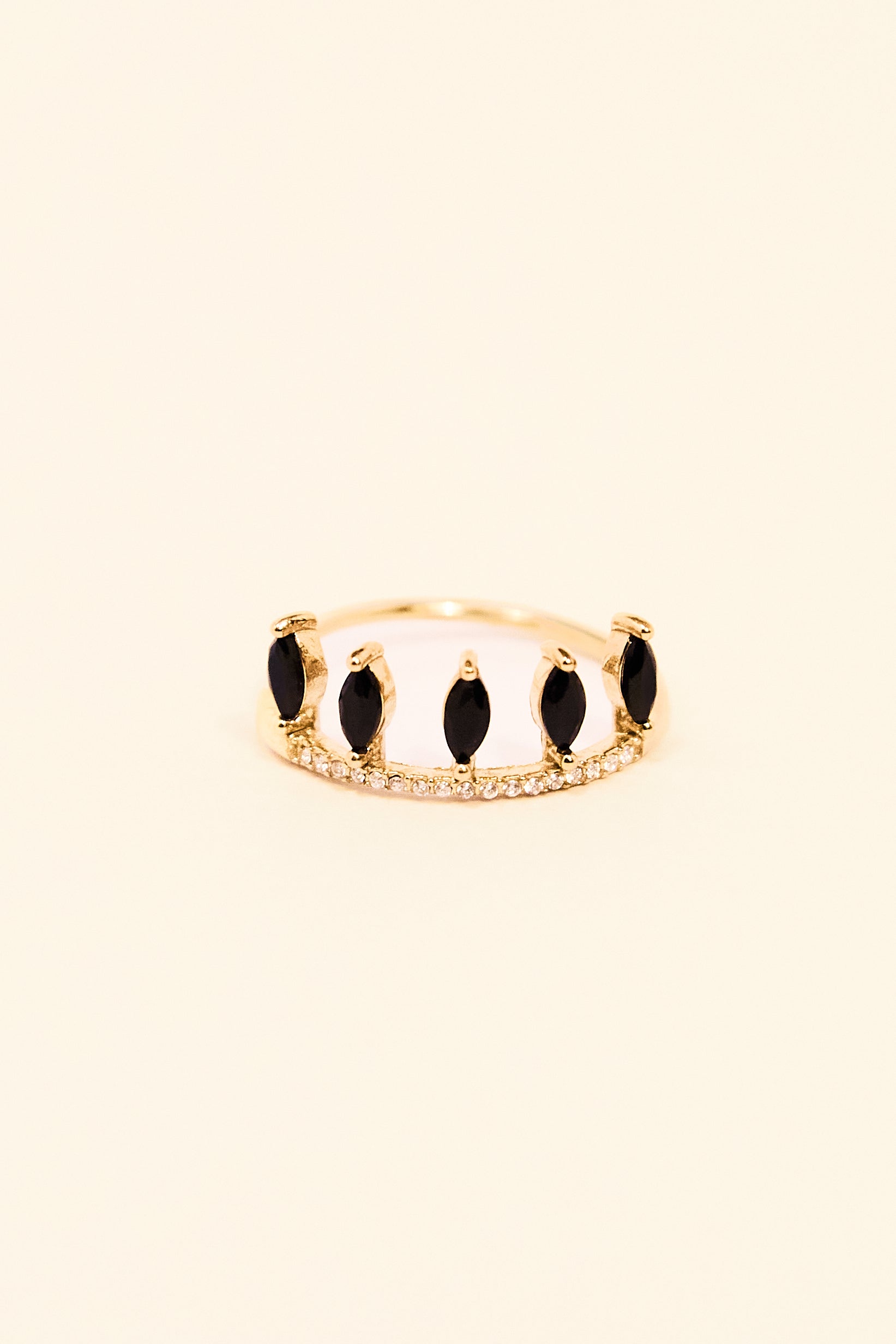 Bold, architectural, and undeniably chic, the Onyx Throne Ring features a striking black onyx-style centerpiece held in a deep, textured gold setting. Curated by Katja Mia for those who love a "more is more" approach to stacking, this ring serves as the perfect anchor for any hand-stack. The innovative adjustable band ensures a perfect fit on any finger, making it as versatile as it is beautiful.